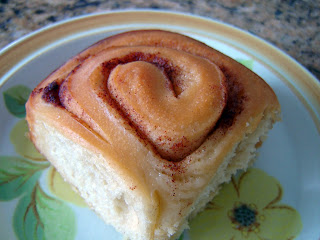 3. Remove from bread pan. Roll dough out into a 14-inch by 18-inch rectangle. Spread another 4 tablespoons of margarine and sprinkle ¼ cup sugar and 1 teaspoon of cinnamon on dough. Roll into a jelly-roll shape. Cut roll into 16 equal slices. Arrange slices into a greased 9x13 inch casserole or 2 greased pie plates. Cover with plastic wrap and let rise for about 45 minutes to 1 hour (or refrigerate overnight, bring to room temperature and bake).